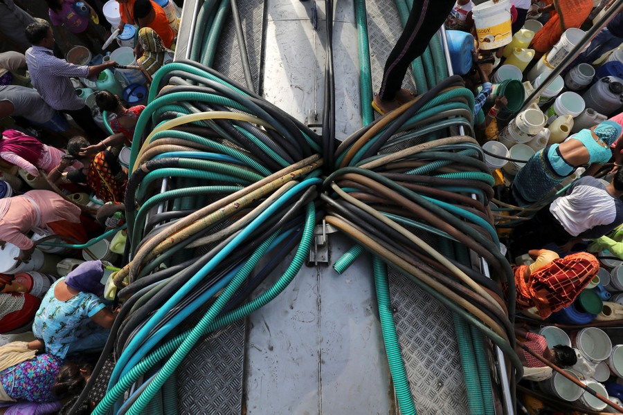 Read moreIn New Delhi, India, residents fill containers with drinking water from a municipal tanker on July 1, 2019. Worsening drought conditions and record-high temperatures this summer drove up demand and prices for water. #
