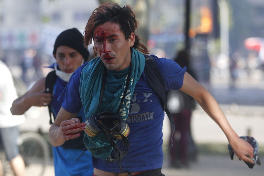 Read moreA demonstrator reacts after being shot with a rubber bullet fired by a Chilean soldier during a protest against Chile's state economic model in Santiago on October 20, 2019. #