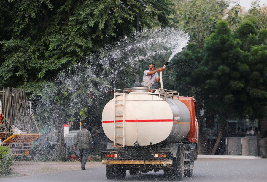 Read moreA man sprays water mixed with an ecologically safe reagent on a road to help the precipitation of suspended particulate matter near the venue of a half-marathon in New Delhi on October 19, 2019. #