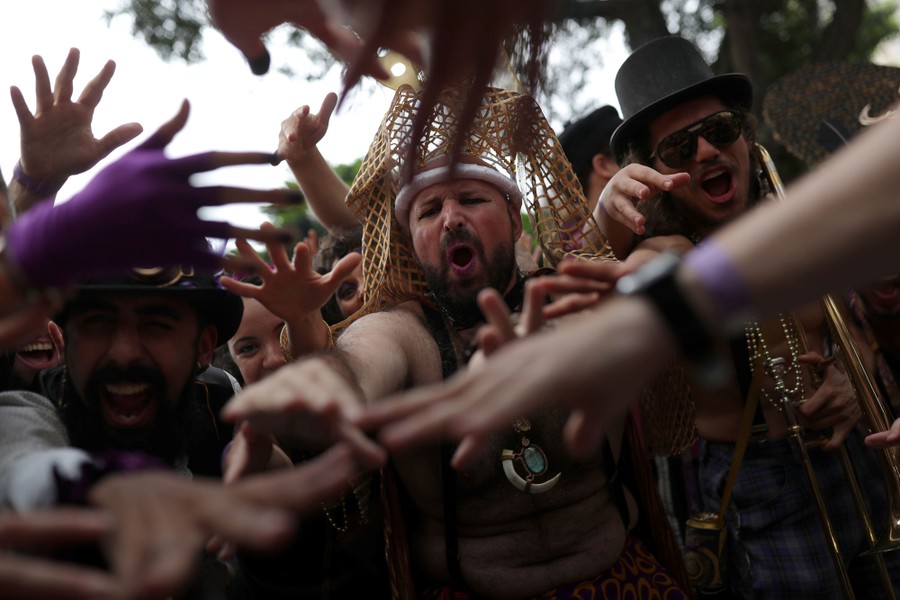 Read moreRevelers participate in the Amigos da Onca street party in Rio on February 22, 2020. #
