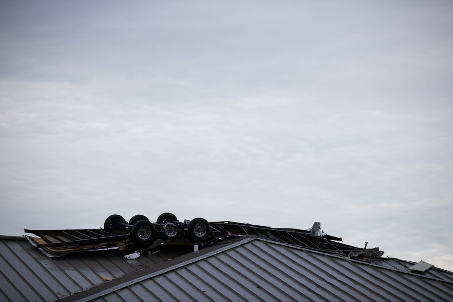 Read moreA trailer frame rests on the roof of a building, blown there by high winds from one of several tornadoes that tore through the state overnight on March 3, 2020, in Cookeville, Tennessee. #