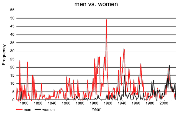 One interesting trend is that mentions of men tick up significantly during wartime. There's a big jump just before 1920, during World War I, and during the '40s, for World War II, as well as during Vietnam and Afghanistan/Iraq. "Women," meanwhile, barely make an appearance until the 1940s, when women began to participate both in military efforts and the workforce in greater numbers. In 1944, for example, Franklin Delano Roosevelt mentioned women a whopping three times in one paragraph in calling for a draft in order to to reduce "suffering and sorrow and bloodshed":