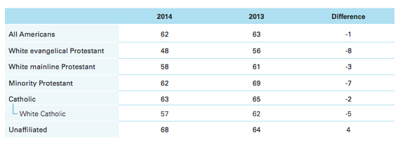 This is all the more remarkable because these numbers came from a callback survey—meaning the very same people who gave their opinions in 2013 gave them again in 2014. In general, Americans feel pretty strongly about the issue: In both surveys, roughly a quarter of of respondents felt that immigration reform should be the country's top policy priority, and another 47 percent said it should be among the highest. In general, there have been few other shifts in attitudes toward immigration in the past year, which hints that this slight downward trend among evangelicals might be about more than frustration with Washington.