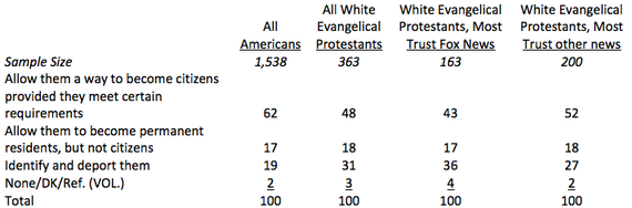 That's the interesting thing about polling people through a religious lens: It's nearly impossible to tell whether faith, or living close to the border, or being Hispanic, or hearing stories about "anchor babies" on Fox News every night makes them feel a certain way about immigration. But to a limited extent, researchers can create theories about why people hold certain beliefs, and in this case, it looks like being evangelical matters less than being white, voting Republican, and relying on one, "fair and balanced" network for news.