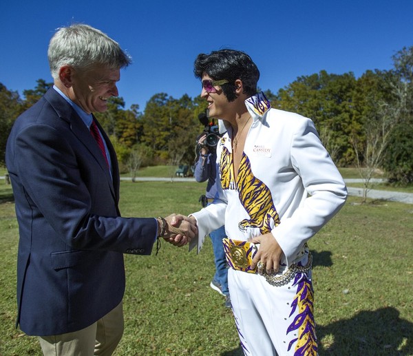 Senate candidate Bill Cassidy of Louisiana greets Dixon 'LSU Elvis' McMakin during a campaign rally. (Scott Threlkeld/AP)