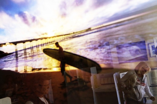 Sandy Greenfield is reflected in an image of a surfer as she votes during elections Tuesday, Nov. 4, 2014, in San Diego. (Gregory Bull/AP)