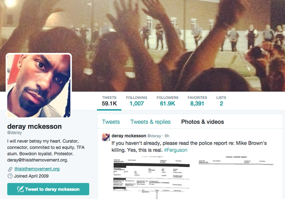 Yet activists themselves often argue that social media is important to their work. DeRay Mckesson, who has emerged as one of a number of leading organizers and activists against police brutality, has spoken on his feed about how vital Twitter is for boosting a movement. When he first drove from his home in Minneapolis—where he works as a school administrator, traveling for protests mainly on weekends—to Ferguson to participate in the protests, Mckesson knew no one; he didn't even know where he would sleep. Facebook networks found him a couch, and social media was vital in connecting him with the community of protestors. Mckesson reports live from protests through Twitter, where his following has ballooned from 800 followers to more than 61,000 since he began his activism. He's also used social networks to raise awareness and to organize, by for example creating a text-message alert that informed thousands the instant the grand jury in Ferguson returned a no-indictment verdict in the Michael Brown case.