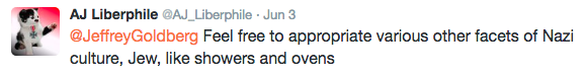 I include this one as an example of the juvenile approach many Twitter anti-Semites take. I’m hoping the ADL identifies some of these trolls, and let’s us know how old they are.