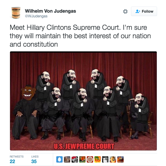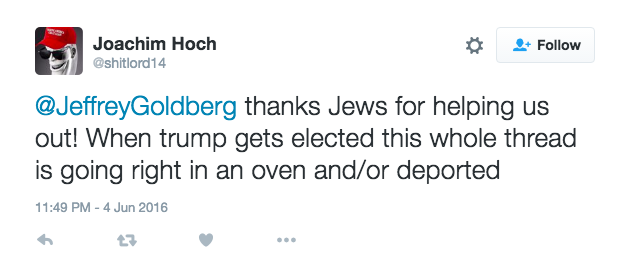 A very large portion of these accounts associate themselves with Trump in some way, though it should be pointed out—I find it hard to believe I’m writing this sentence—that Donald Trump himself has expressed absolutely no interest in opening concentration camps for Jews, should he win the presidency. The white nationalist far-right has decided, though, that Trump will advance its interests.