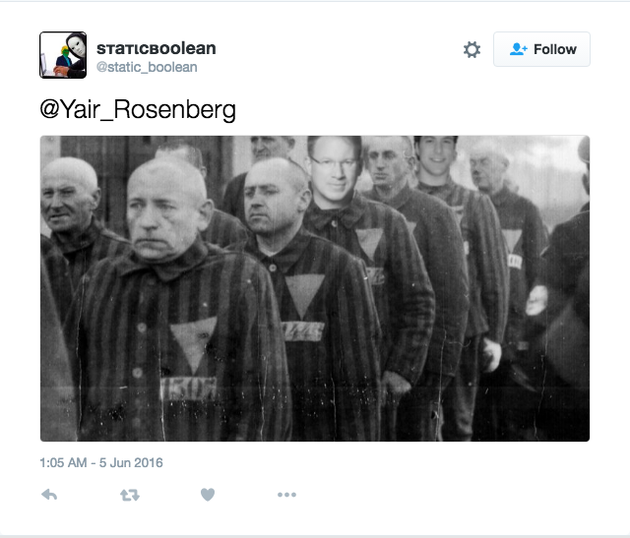 Here is a photoshopped image of me as a concentration camp camp prisoner (two places in front of the journalist Yair Rosenberg). It’s always nice to wake up in the morning to images like this.
