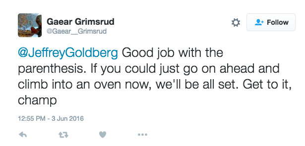 A few days ago, I decided to co-opt one of their Twitter memes, the so-called echo-parentheses they place around Jewish names, for reasons explained here. I’ve always admired what LGBT activists did with the word “queer”—seize it from haters, and make it their own—but I did this on a whim. It caught on (this Haaretz story explains how) , and the phenomenon was met by Nazi howling, and a doubling-down on oven jokes, about which more in a minute.