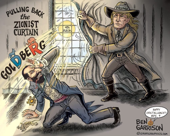 This drawing, which I’ve received a number of times, holds that Donald Trump is bringing about a 4th Reich, and vampire Jews such as myself are doomed. (This is actually a pro-Trump Benjamin Garrison cartoon later defaced by an anti-Semite and spread by other anti-Semites.) Please take note of the “Happy Kristallnacht” message in the lower right corner.