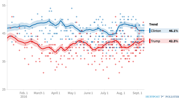 In part, that’s a triumph of bar-lowering, and it doesn’t mean Trump hasn’t said some bizarre things; there’s the burgeoning Trump Foundation scandal, too. It may be that there’s some fatigue setting in with Trump’s many outlandish comments, or it may be, as many progressives insist, that this is all the media’s fault for covering Clinton too harshly. But whatever the reason, he’s mostly managed to let the focus stay on Hillary Clinton, from her failure to hold press conferences to her continued email troubles to her recent illness. It turns out that staying out of the public eye helps Trump, just like it helped her during the weeks when she sat back and let him self-destruct.