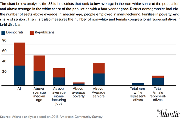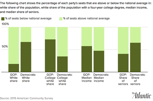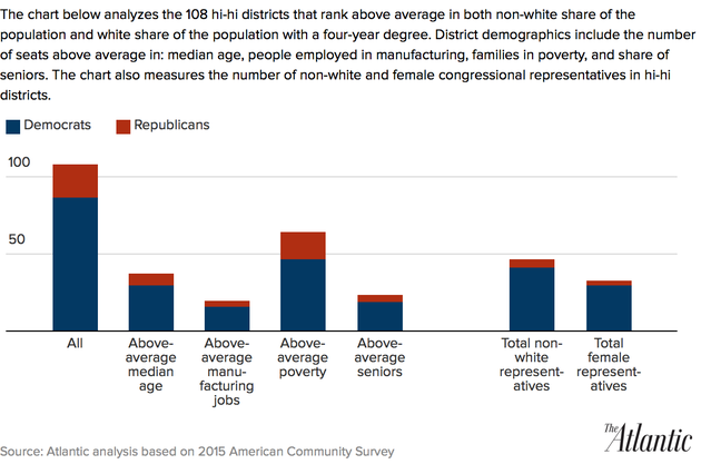 An Atlantic analysis finds that congressional districts’ racial makeup, and their residents’ level of education, largely determines which party represents them in the House.