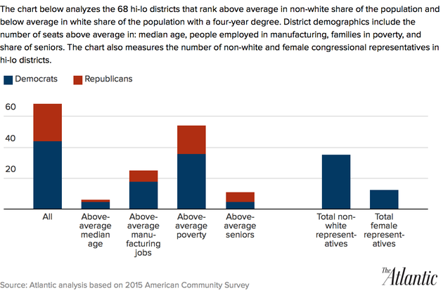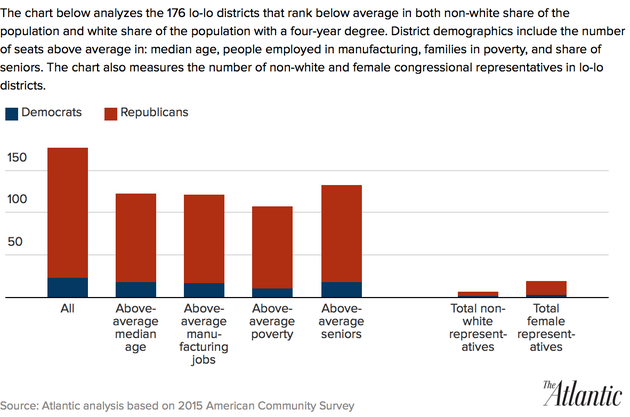 To understand the impact of demography on the House, The Atlantic examined congressional district-level data from the Census Bureau’s 2015 American Community Survey. (The ACS data for 2015 does not take into account the recent court-ordered redistricting in North Carolina, Florida, and Virginia, so there may be some variation from the numbers reported here in the revised districts in those states.)