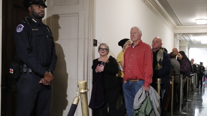 People wait in line to get into the hearing room ahead of former Ukraine Ambassador Marie Yovanovitch's testimony last week. (JACQUELYN MARTIN / AP)