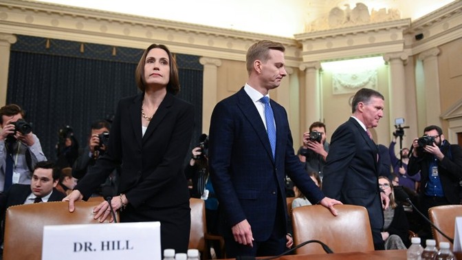 Fiona Hill and David Holmes take their seats before a House Intelligence Committee hearing. (ERIN SCOTT / REUTERS)