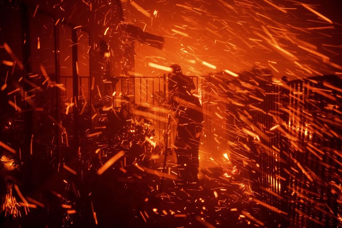 In the photograph above, Jerry Rowe uses a garden hose to save his home on Beaufait Avenue in Granada Hills, California, during the wildfires that tore through large swaths of California in October.
