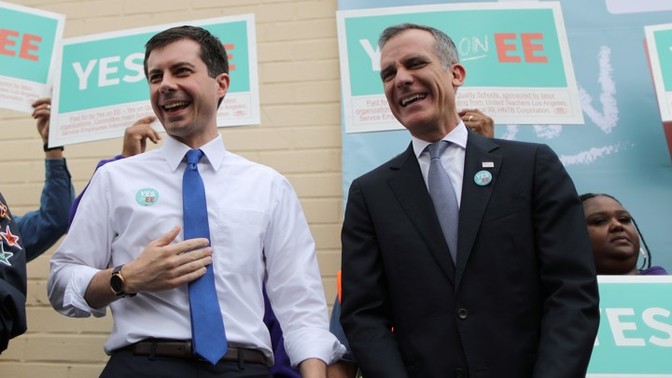 Former South Bend, Indiana Mayor Pete Buttigieg and Los Angeles Mayor Eric Garcetti in 2019. (LUCY NICHOLSON / REUTERS)