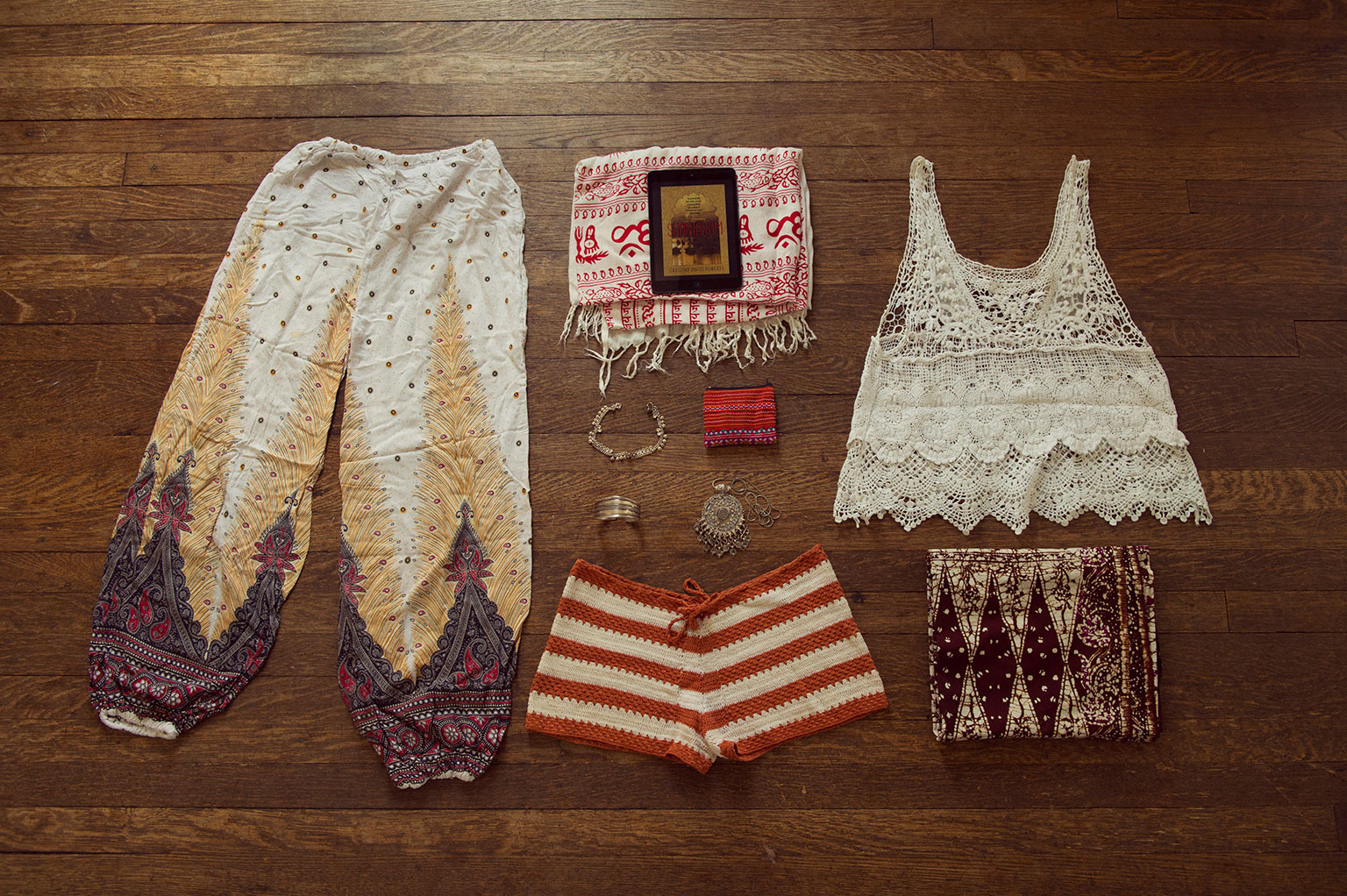 Adler had a habit of collecting mementos from the different places she visited, as many travelers do. But, knowing she’d have to carry them with her for months, she made sure they’d all serve a purpose during her travel, like these woven, striped shorts she wore nearly everyday to the beach in Goa.