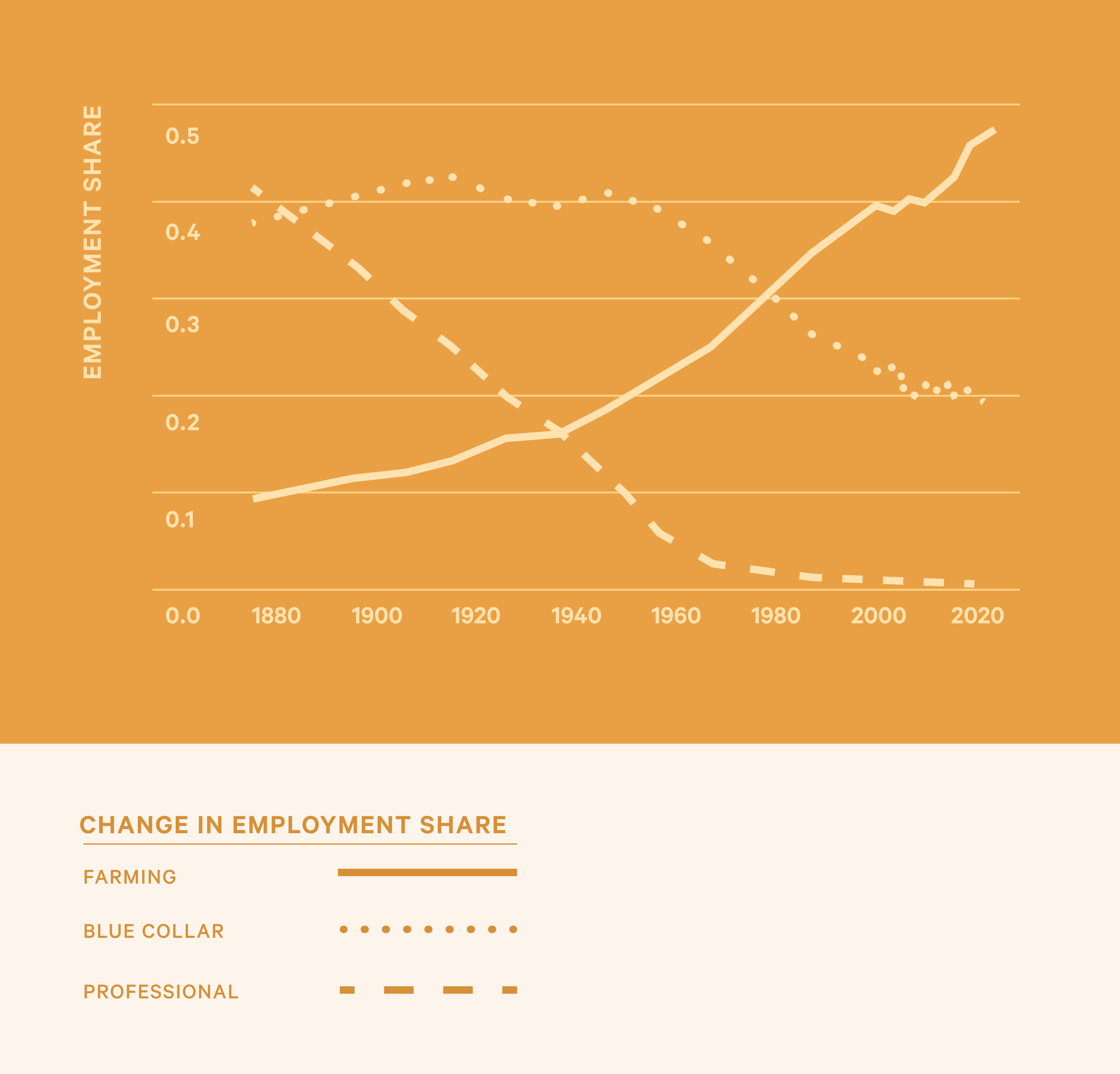 Technology reshapes jobs over time. Computers and the internet have reduced blue-collar roles while increasing jobs in professional fields—just as farm work dropped as production became more mechanized, creating new factory jobs.