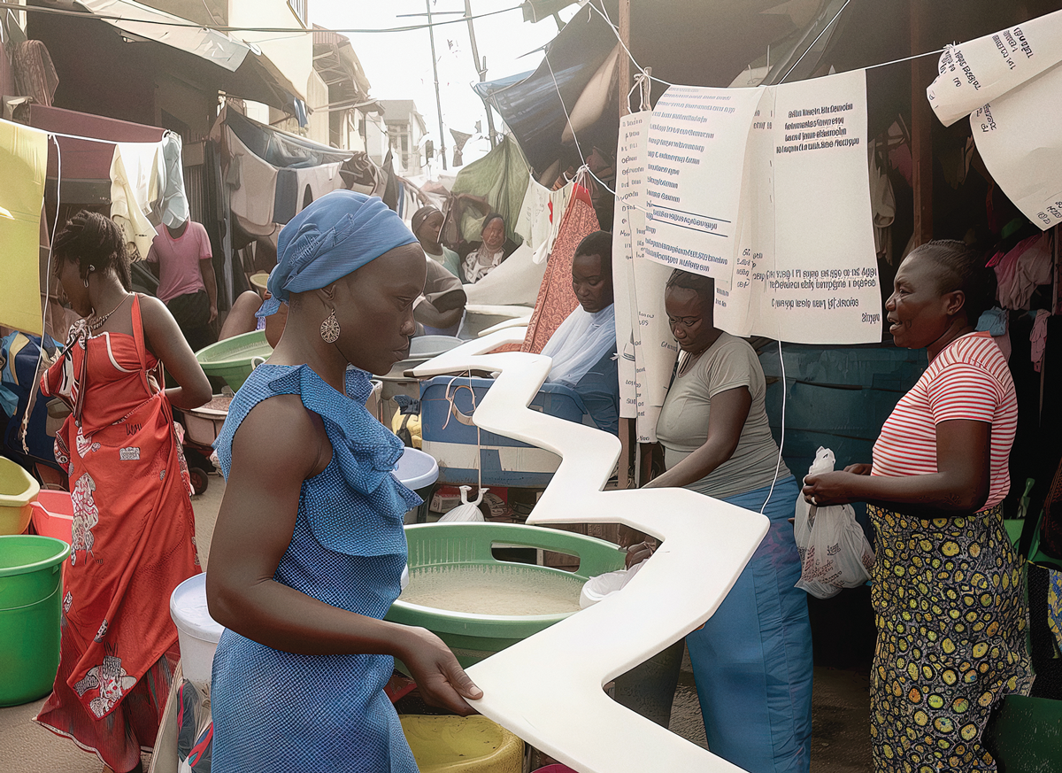 More about the work: In January 2024, Charlie visited Accra, Ghana, to speak to locals about their perceptions of AI. Most of the people Charlie interviewed were connected to his work with the Or Foundation, an NGO working at the intersection of environmental justice, education, and fashion development; many of the conversations centered around the environmental and socioeconomic impacts of waste colonialism and global commerce. Charlie employed Midjourney to create the images, using photographs he shot on location as prompts. The people in the images are digital representations of fictitious Ghanaians engaging in hypothetical scenarios, as envisioned by the interview participants.