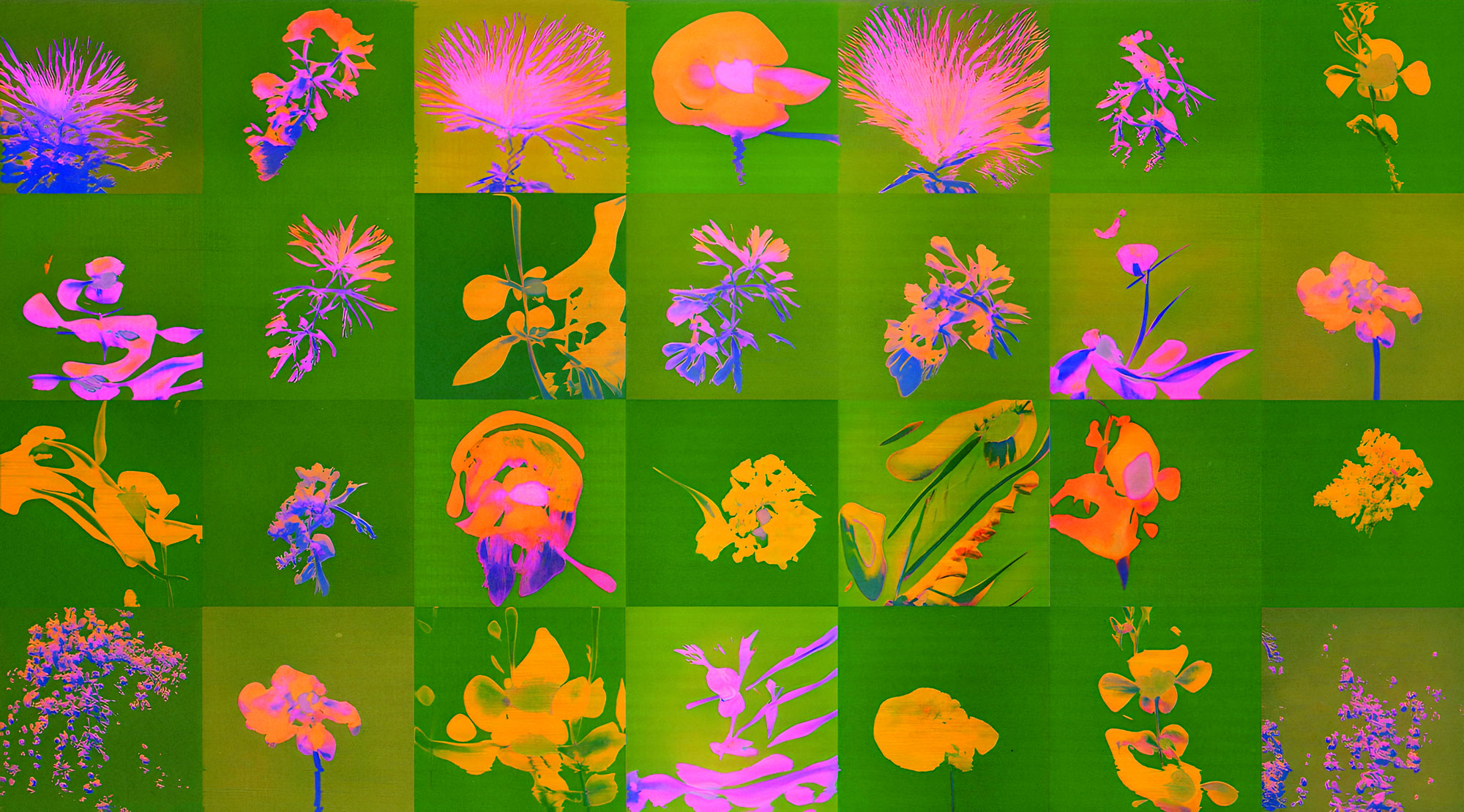 AI in Bloom offers an abstract journey through the shifting climate of the Sahel. The process begins with a GAN producing images based on 2,000 abstract acrylic pieces handcrafted by Linda. These AI-generated pieces are then meticulously arranged in a grid, organized by color and structure.