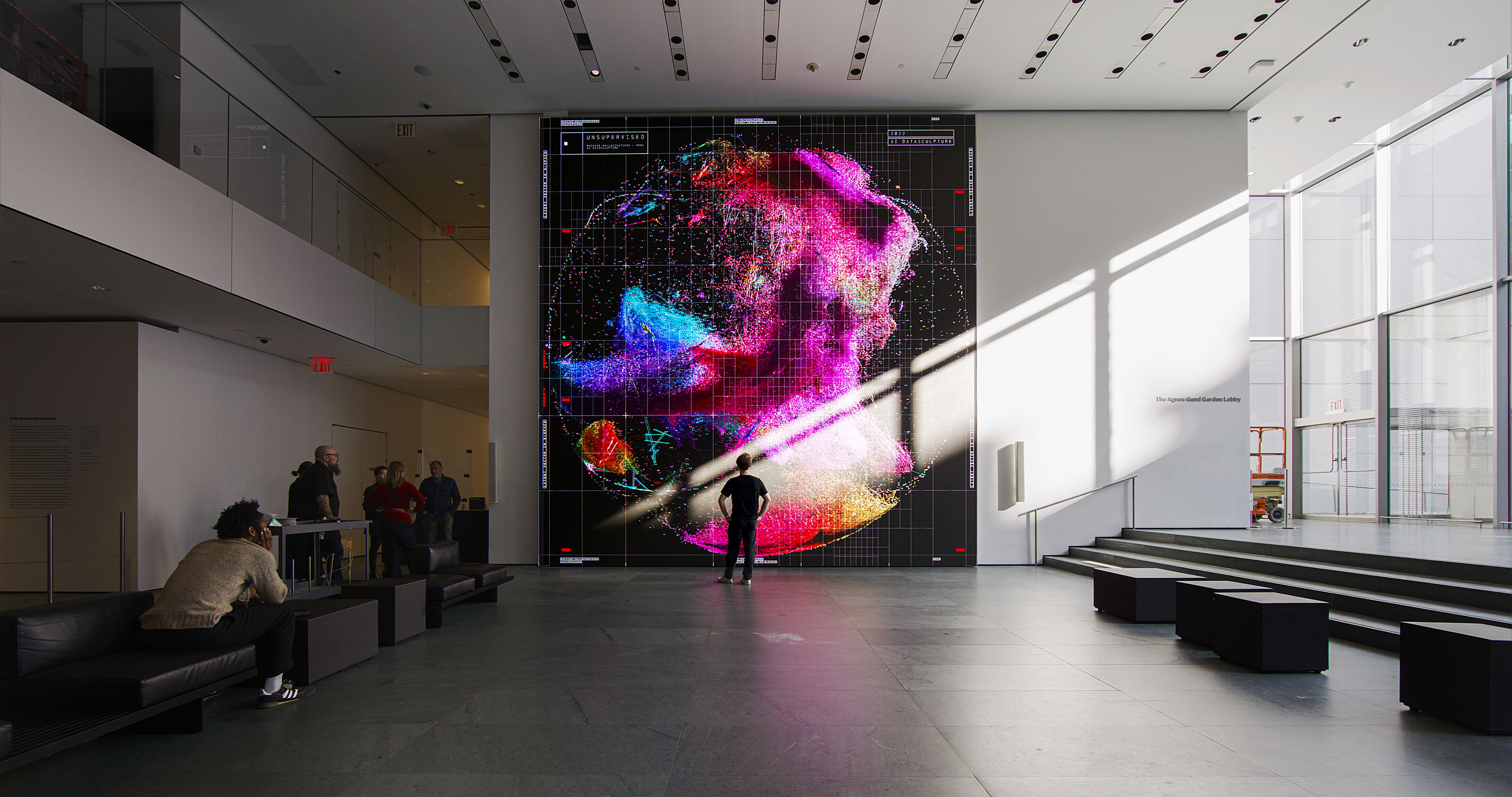 For Unsupervised at the Museum of Modern Art in New York City, Anadol used AI to interpret and transform more than 200 years of art at MoMA to answer this question: What would a machine dream about after seeing the MoMA collection? As the model “walks” through its conception of this vast range of works, it reimagines the history of modern art and dreams about what might have been—and what might be to come. While AI is often used to classify, process, and generate realistic representations of the world, Unsupervised explores fantasy, hallucination, and irrationality, creating an alternate understanding of art-making itself. The artwork was displayed on a large-scale media wall in MoMA’s ground-floor Gund Lobby between November 19, 2022, and October 29, 2023, and was recently added to the museum’s permanent collection.
