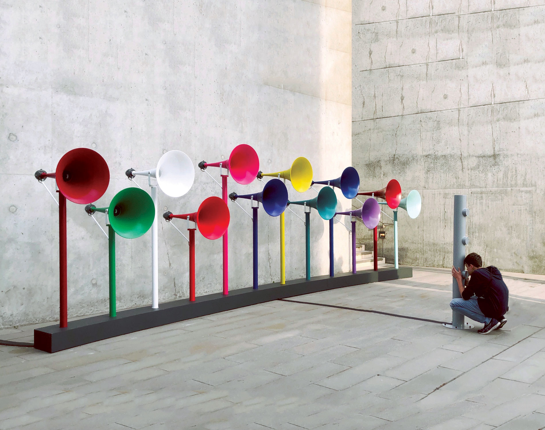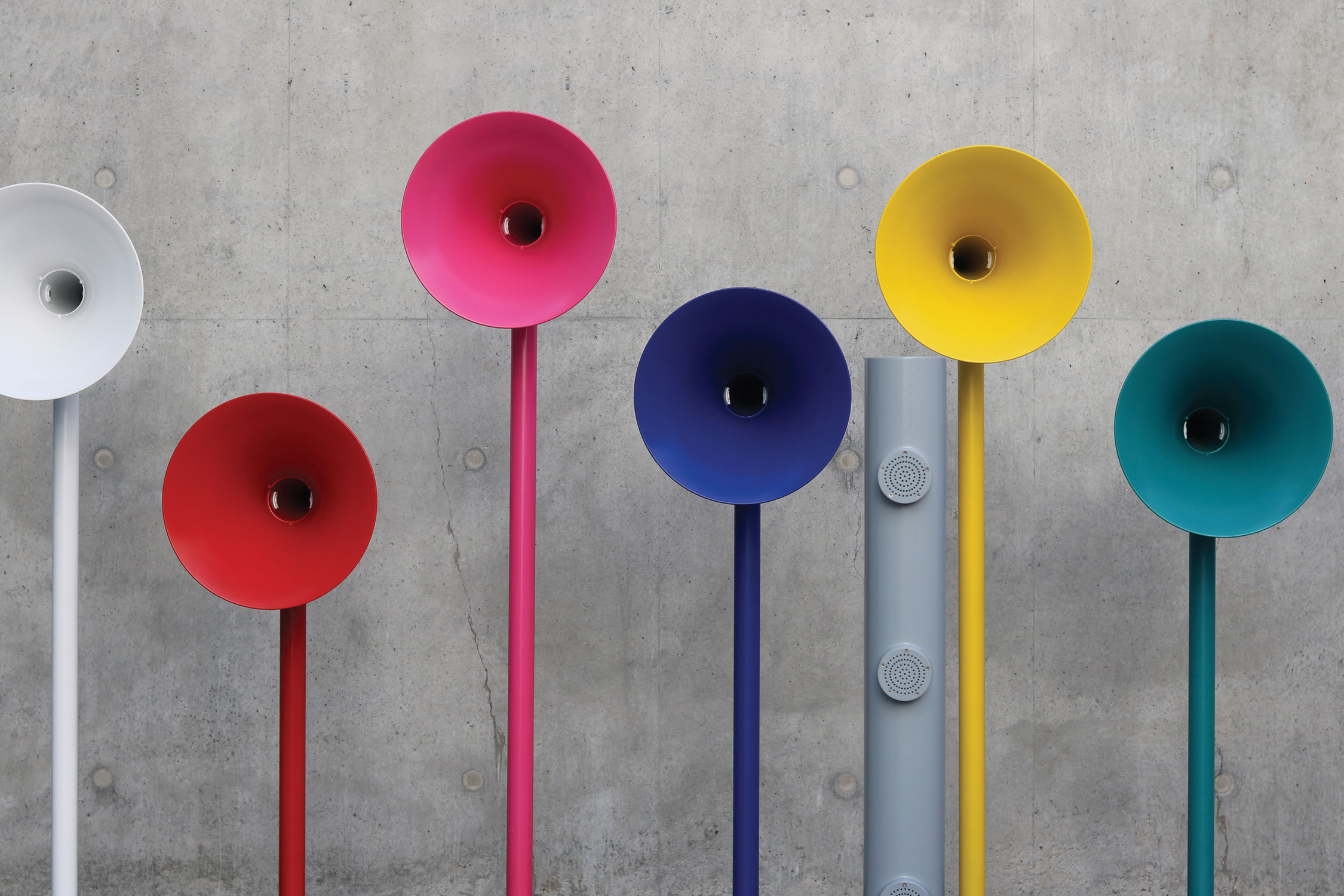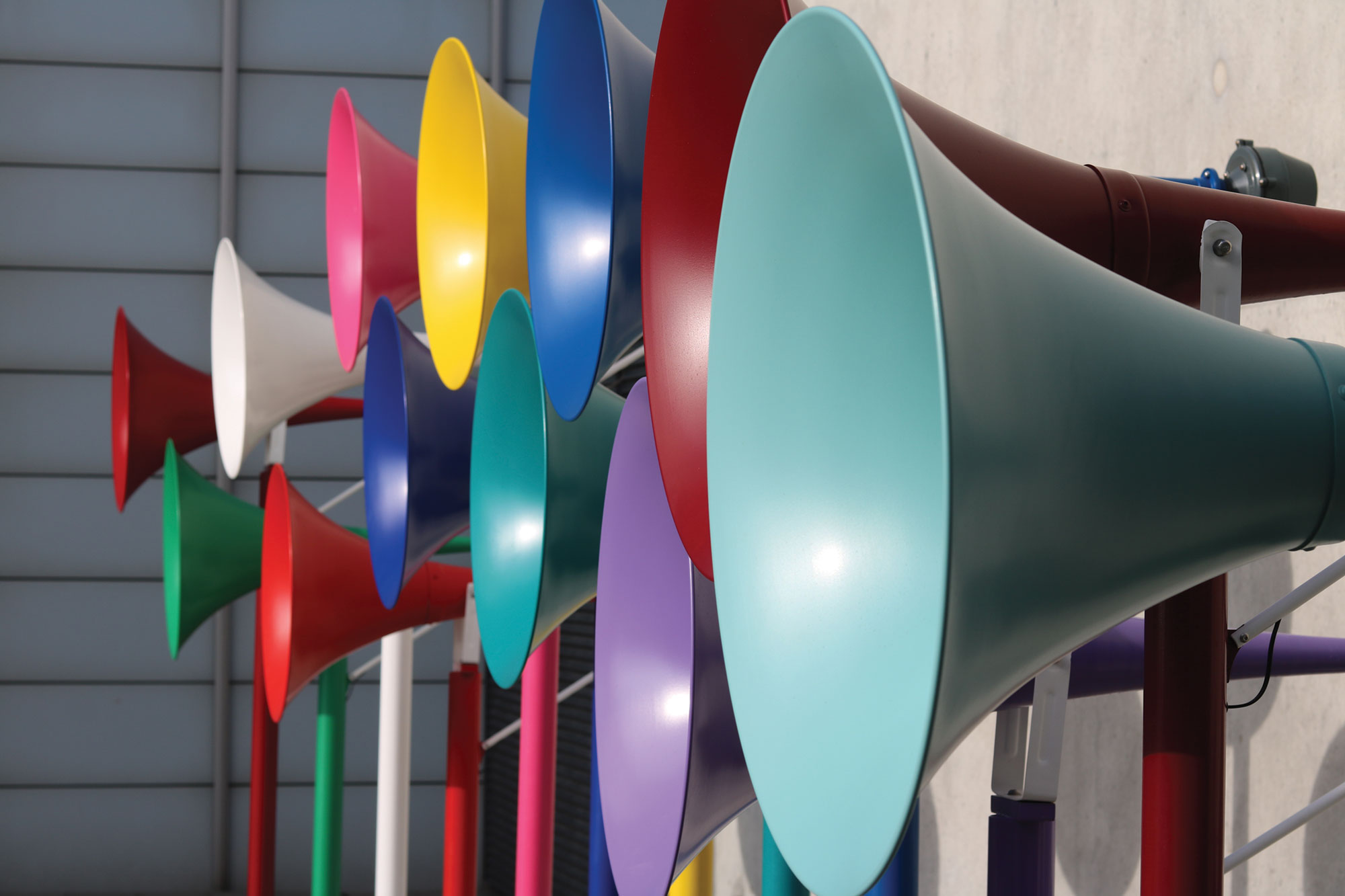 His piece, The Welcome Chorus, is an amalgamation of sound, sculpture, and AI. Created for the Margate NOW festival in 2019 and commissioned by Turner Contemporary, this interactive installation features 12 horns, each symbolizing a distinct district of Kent, England.