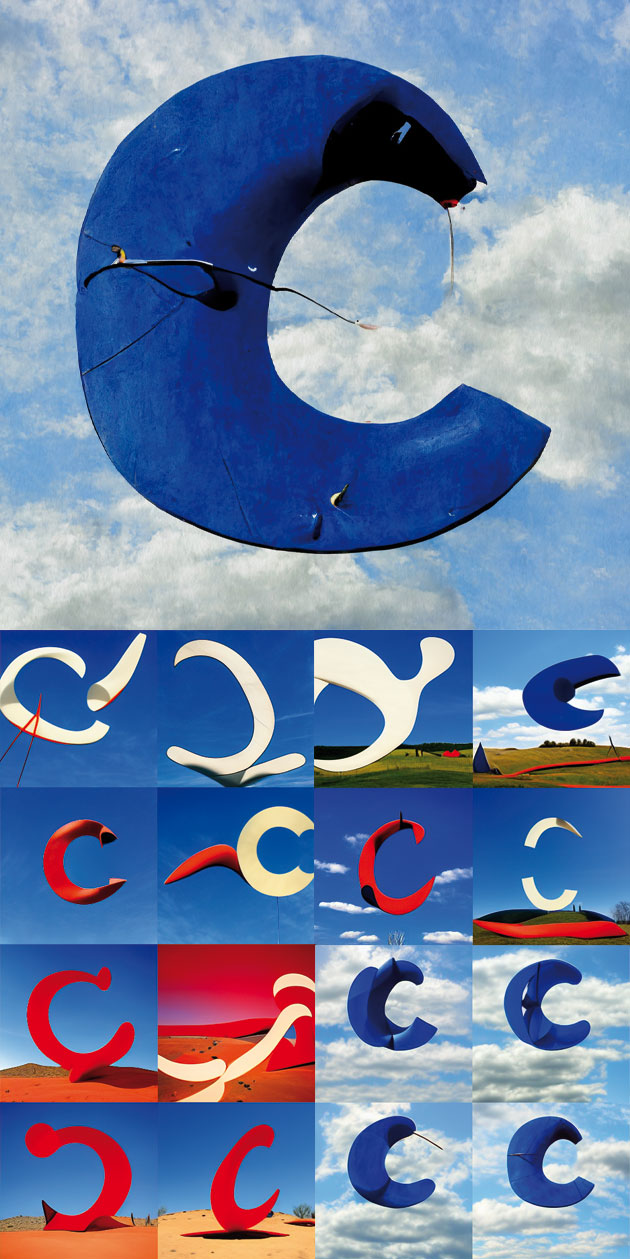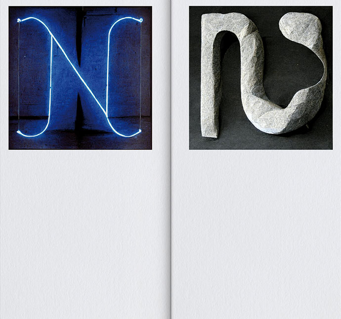 Artificial Typography is born out of the juxtaposition of the ephemeral and the timeless. This book explores the rapidly evolving field of AI through our longstanding Latin alphabet. The book contains 26 letters re-imagined by AI. Each letterform is interpreted twice through the lens of 52 iconic artists across various media (painting, sculpture, textile). The typographic space is especially great for this exploration, since it’s a world of ideas where general conventions rule, but where there is endless opportunity for unexpected interpretations, with new recipes arising every day. At its heart, the book is driven by a curiosity to see how far AI could push visual language, and it holds many surprises, especially when the structure of letterforms are combined with materials like stone (e.g. Noguchi) or even light installations (e.g. Bruce Nauman).