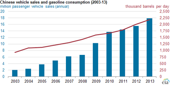 Over the past decade, the number of cars sold in China has jumped from 2 million a year to nearly 20 million. No surprise, then, that oil consumption soared from 250,000 barrels a day to 2.25 million barrels a day between 2003 and 2013, according to a new report from United States Energy Information Agency. As a result, since 2009, China has been forced to import half of its oil.