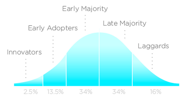 This usually plays out along a bell curve, as Everett Rogers explained in his classic book, Diffusion of Innovations. Which means we might expect more Millennials among the early adopters and more Baby Boomers among the laggards.