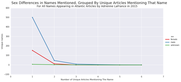We included 192 of the articles I wrote for The Atlantic last year. All in all, I mentioned 736 different people and only 165 of them were women—meaning women accounted for just over 22 percent of the unique individuals I named or quoted in my work last year. (If you look at total mentions instead of unique mentions, it’s even worse. Out of the 2,301 names that appeared in my work last year, 1,839 of them were men. That leaves just 428 mentions of women: under 19 percent of total mentions. This suggests, and we were later able to confirm, that even when I do mention women, I give men more space in my stories.)