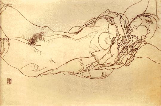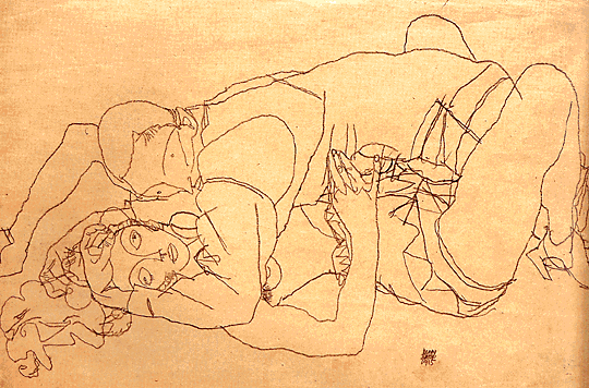 The only persuasive way to judge a work of art is to gauge whether it is true to itself, whether it has achieved what it set out to achieve. Schiele's tortuously cerebral art tends to be disastrously at odds with his erotic intentions. The show's catalogue assertively refers to the art historian Albert Elsen's contention that Schiele used Rodin's technique of "continuous drawing," in which the artist sketches while never taking his eyes off the model. This, critics such as Updike and Schama argued, repeating the idea, accounts for Schiele's visceral spontaneity. Yet look at Rodin's flowing sensuous line in a drawing like Love Asleep (undated) -- as erotic as anything Schiele did -- alongside Schiele's studied angularity, which grows ever more complex and involuted. Schiele could not possibly have achieved such a tangled, cerebral effect through "continuous drawing." Schiele's line, in fact, is fraught with self-reflection. In Reclining Woman with Raised Chemise (1914), or Kneeling Woman with Head Bent Forward (1915), Schiele tied his sensational subjects to the bedframe of self-consciousness. As his career progressed, his line became claustrophobic, strangulating. Consider the study for Act of Love (1915) -- it's as if he were transforming the silent commotion of sexual intercourse into an analysand's monologue. His pictures collapse into the chasm between his divided intentions: he wants to shock and titillate through the depiction of sexuality, but he cannot escape his own tormented self-consciousness about sexuality.